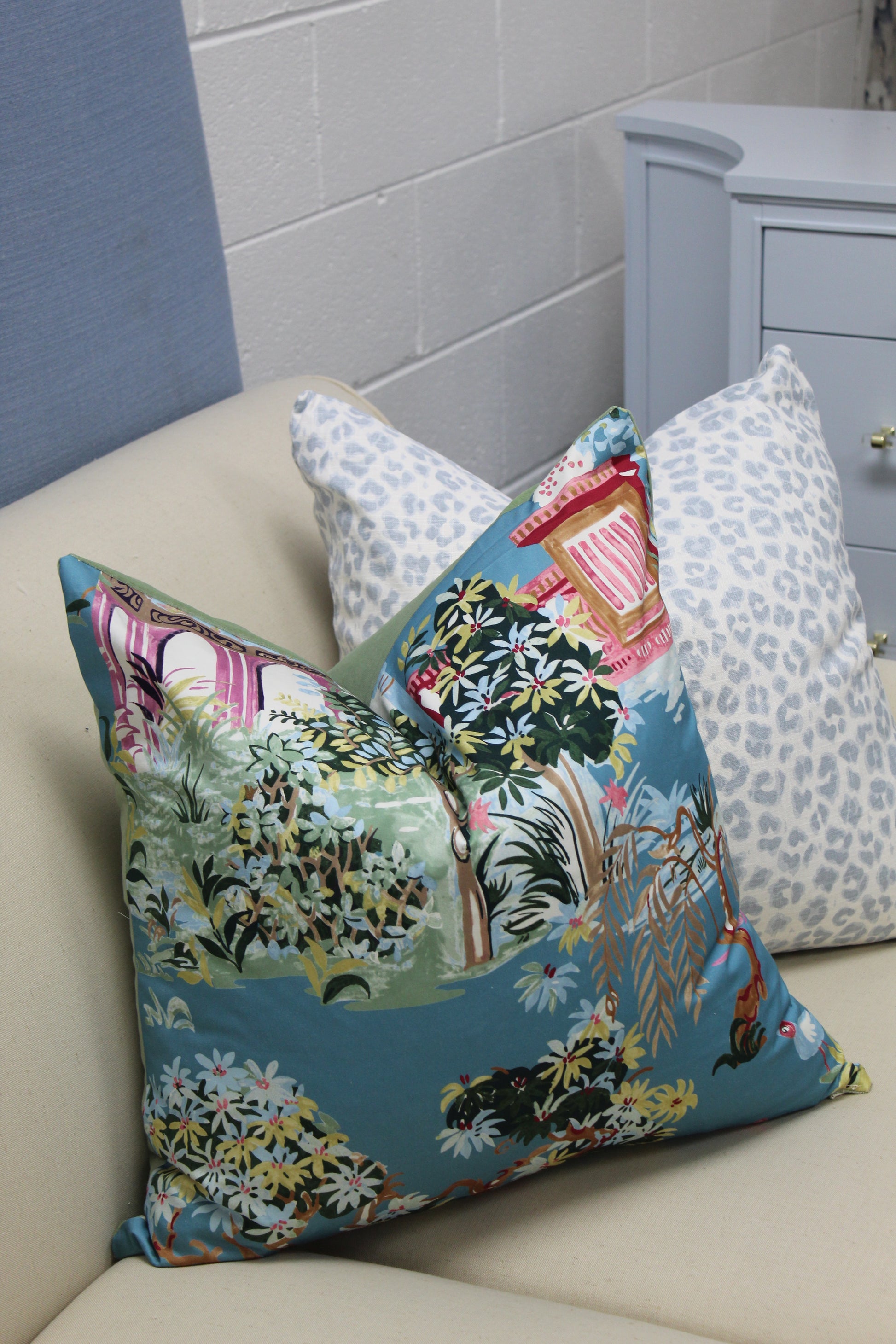 Thibaut Mystic Garden fabric with a coordinating green velvet back.
